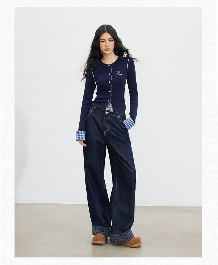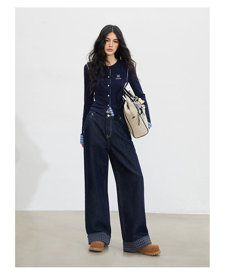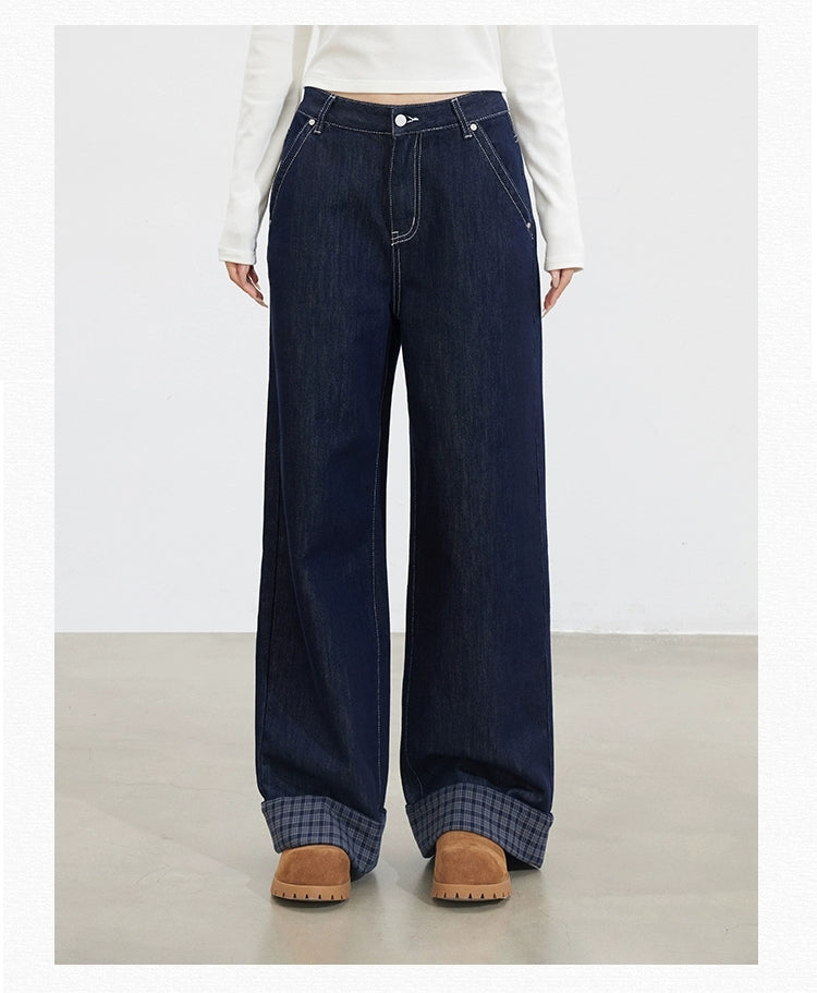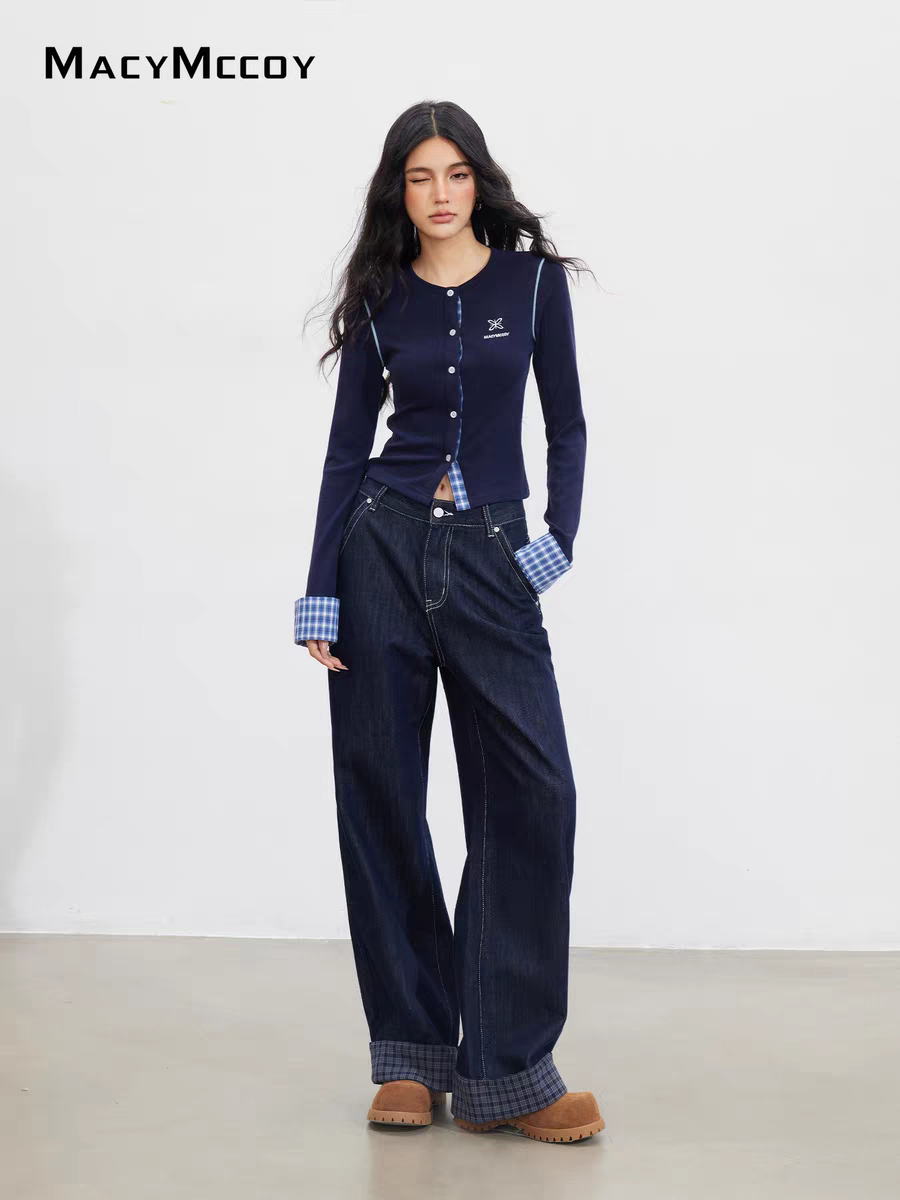 MacyMccoy 2510 格子牛仔拼接阔腿裤