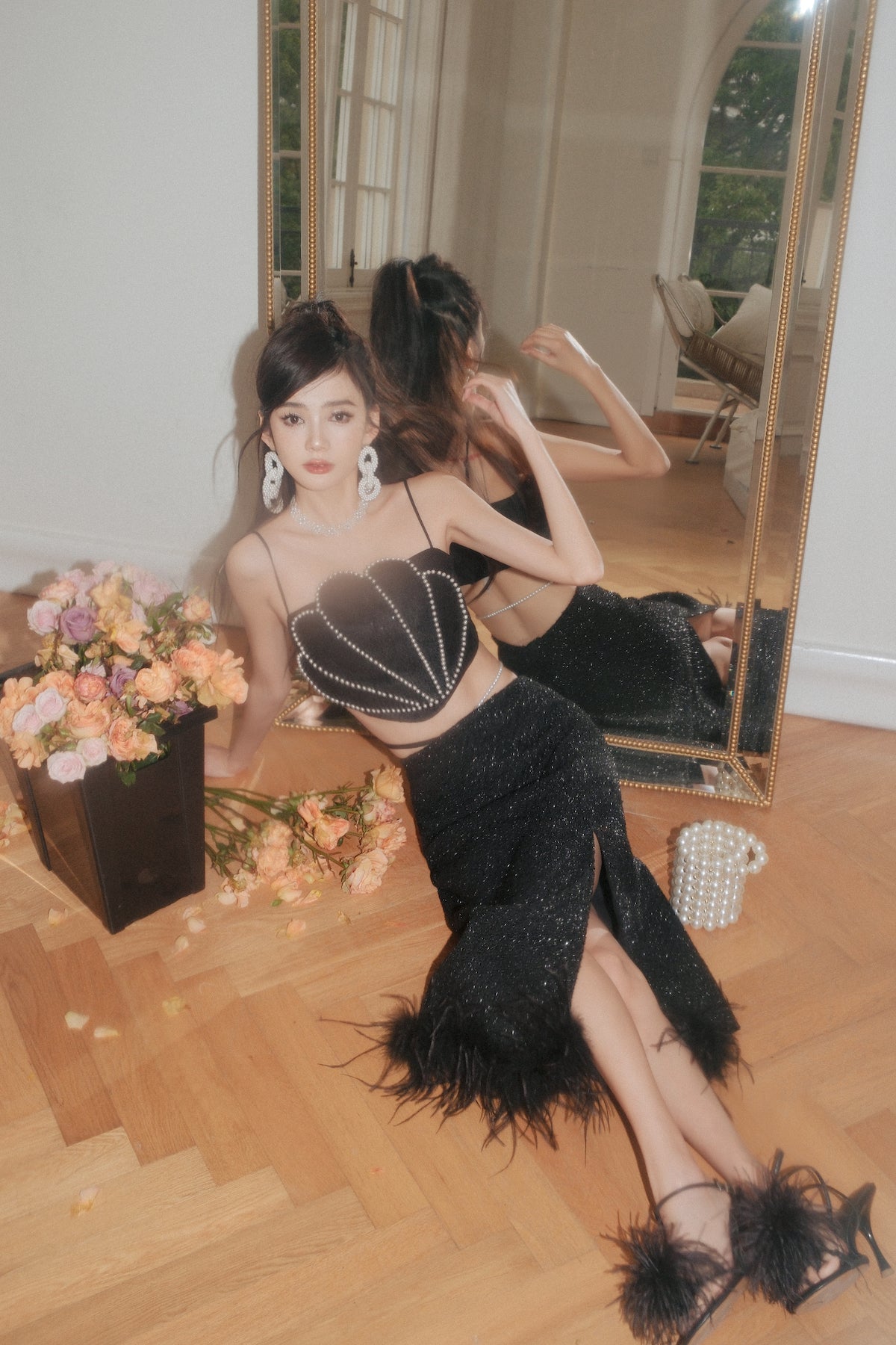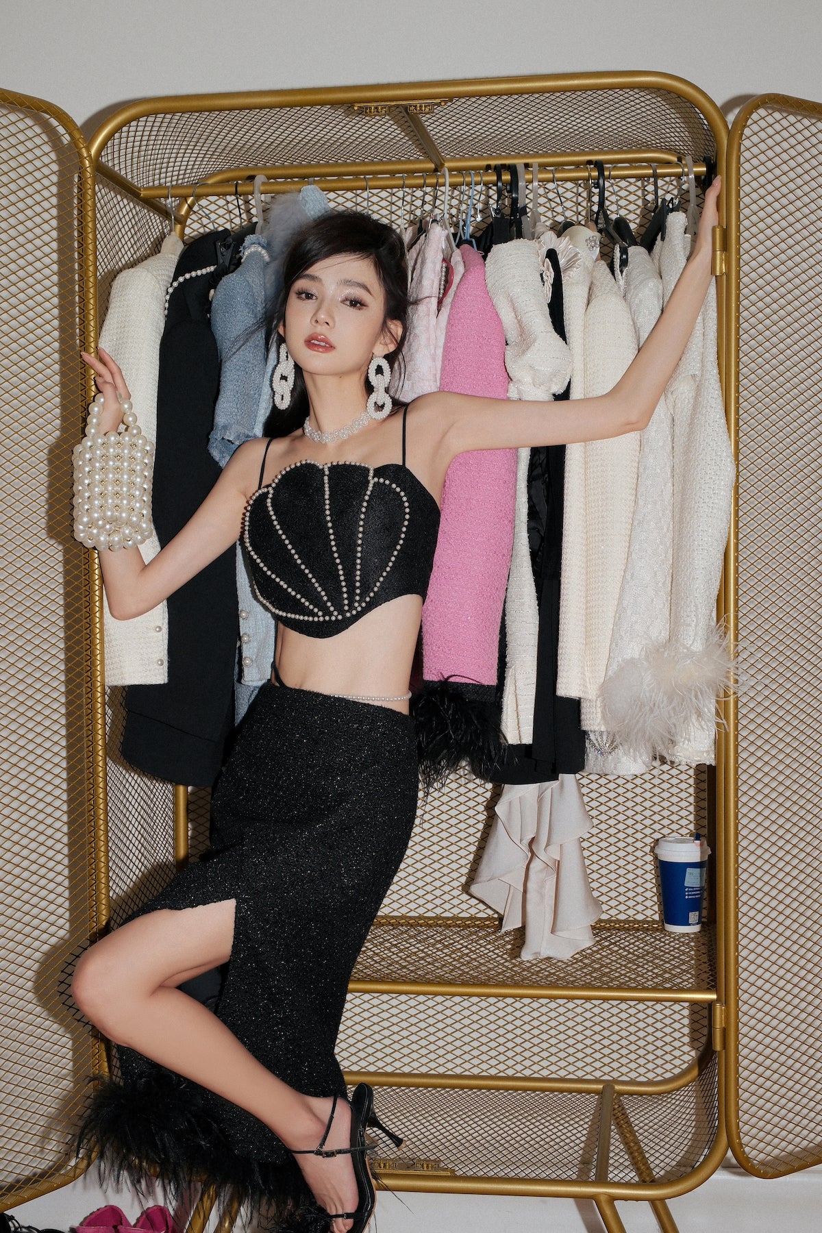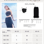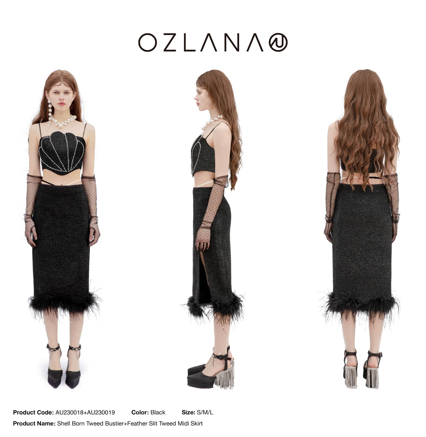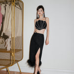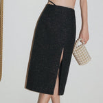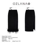 OZLANA SS2303 Feather Slit Tweed Midi Skirt