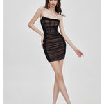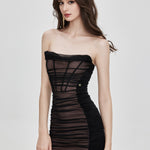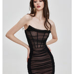SHEER LUCK 2405 网纱褶皱抹胸法式连衣裙 黑