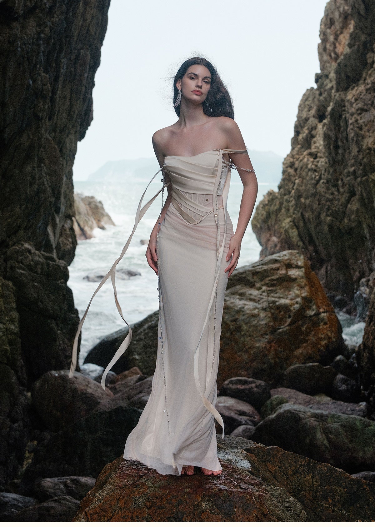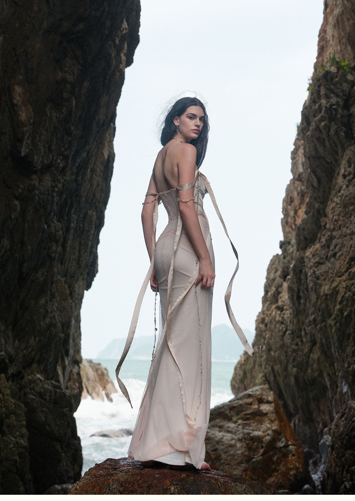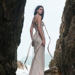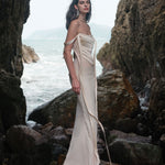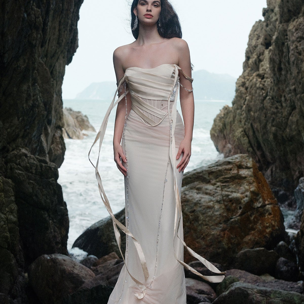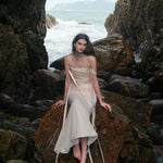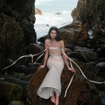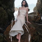 SHEER LUCK 2502 珠链飘带性感气质包臀抹胸鱼尾连衣裙 奶油杏