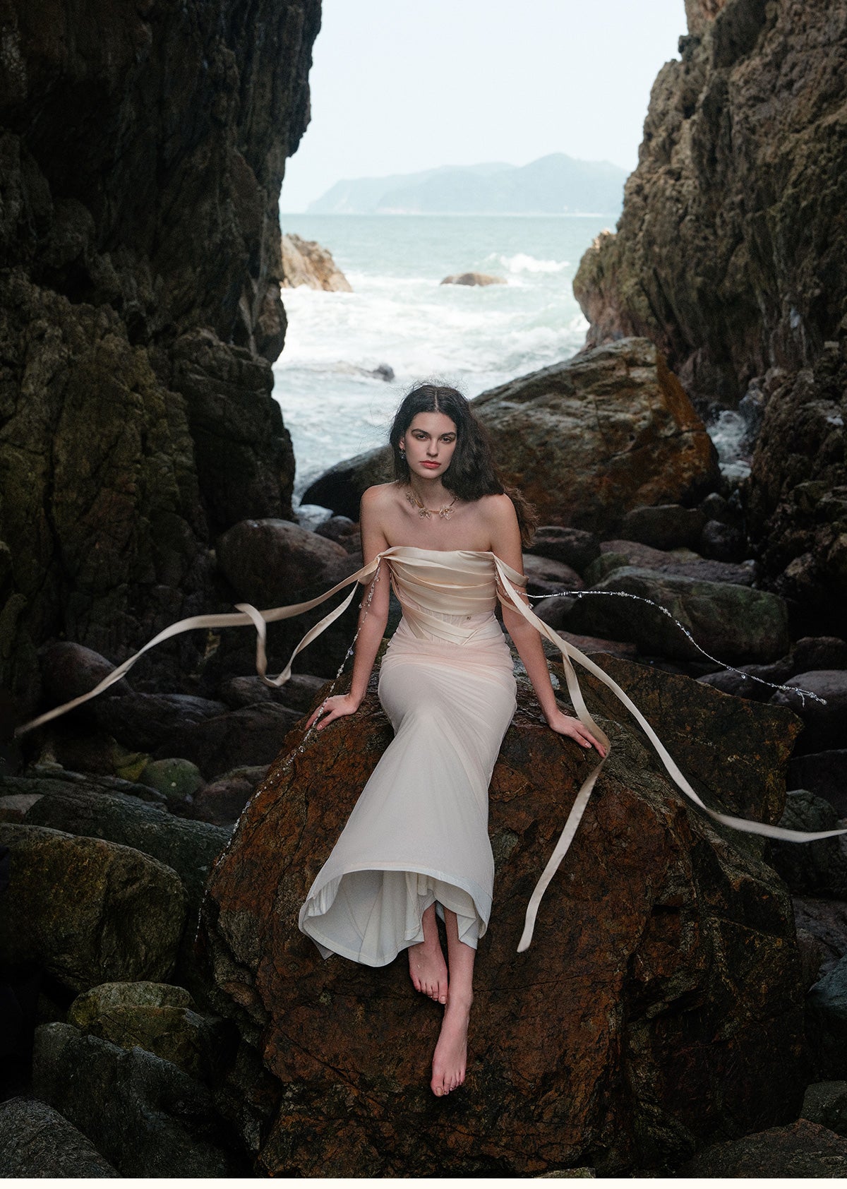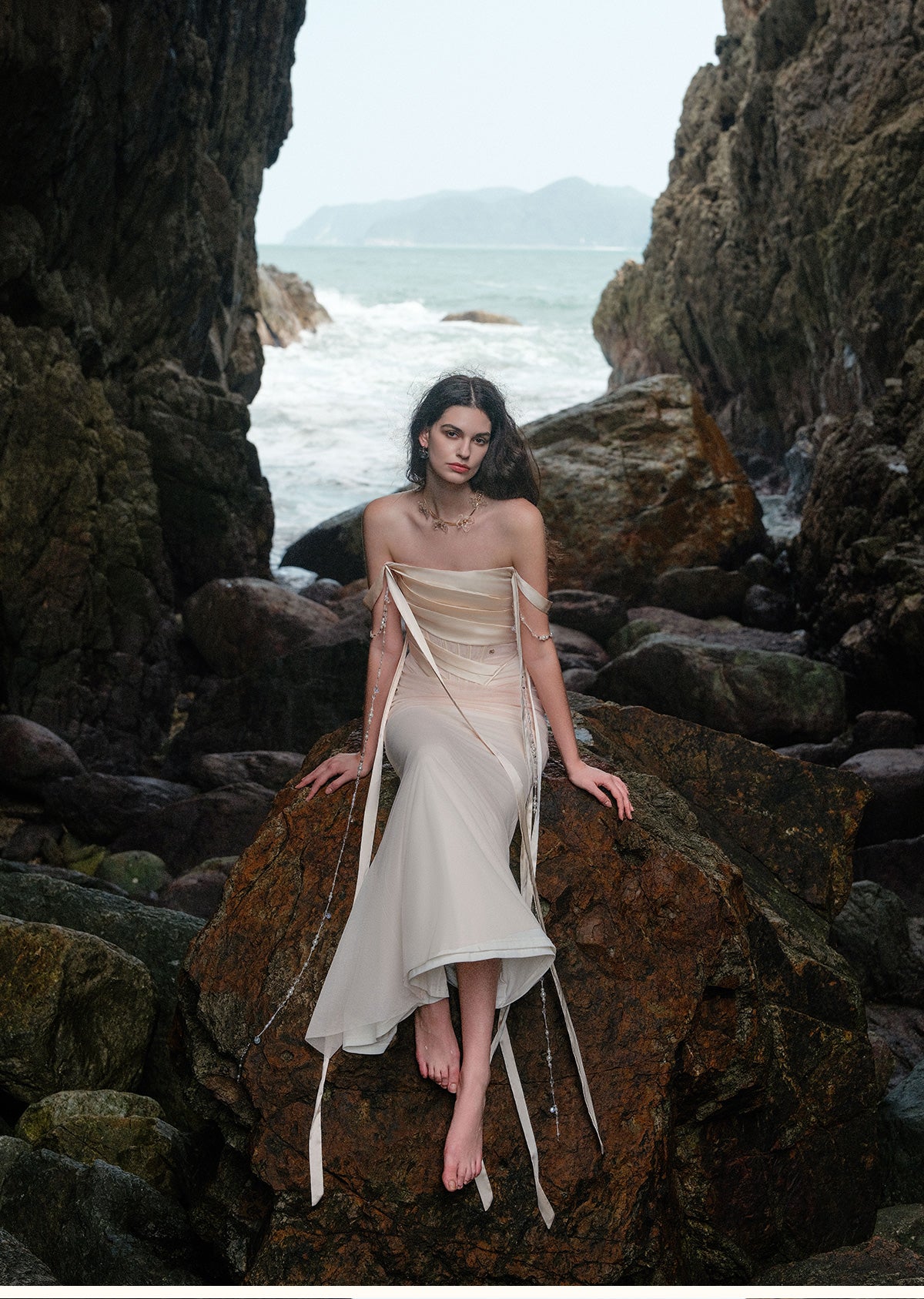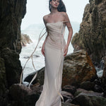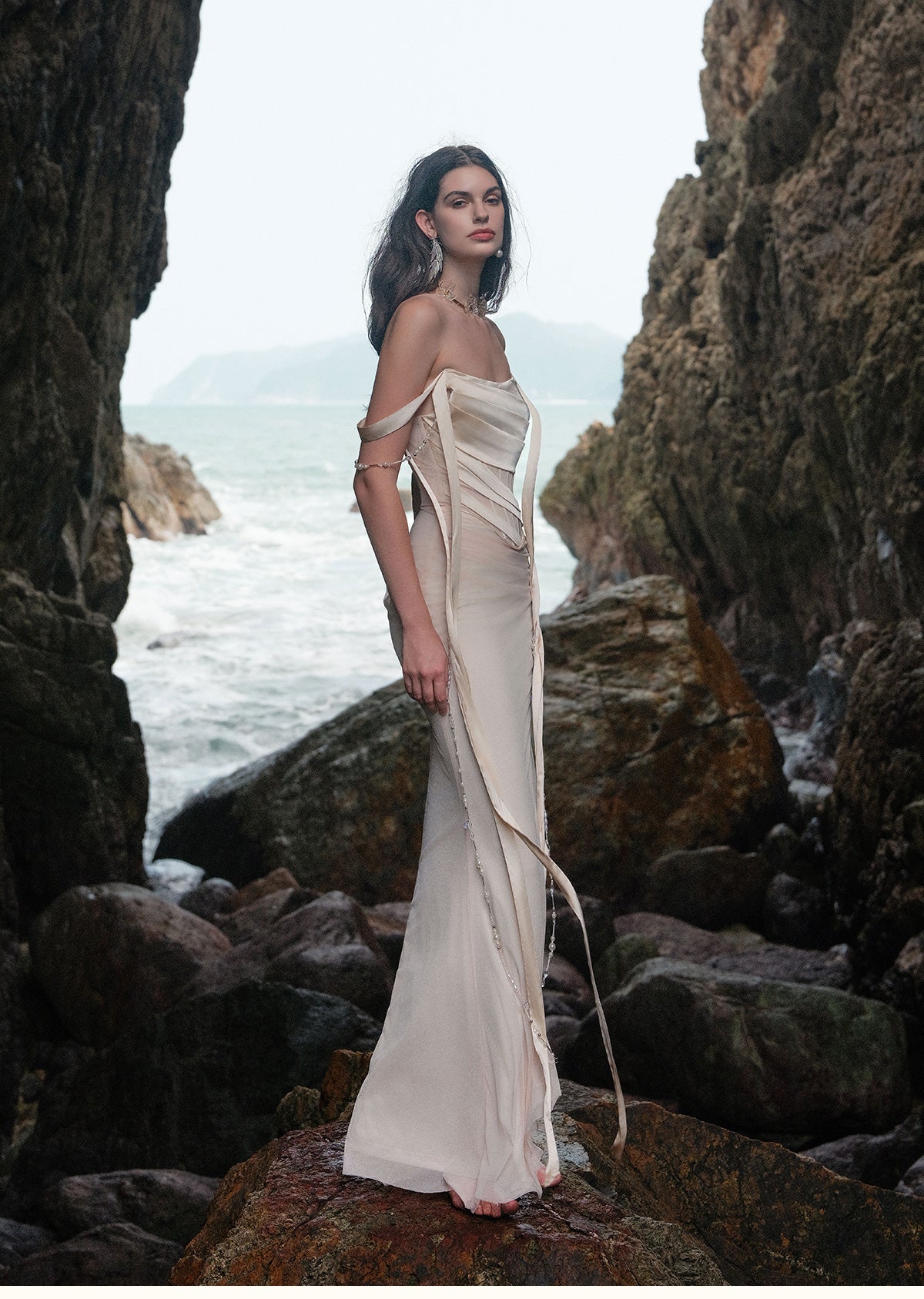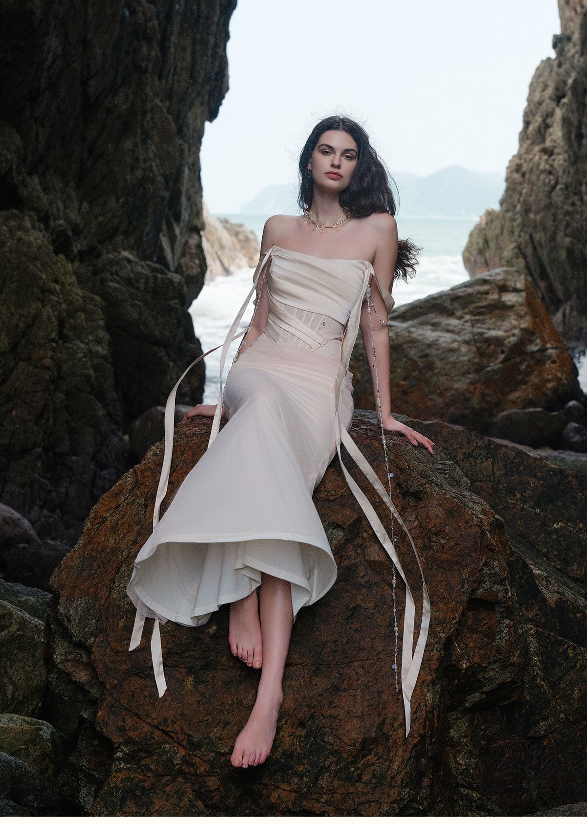 SHEER LUCK 2502 珠链飘带性感气质包臀抹胸鱼尾连衣裙 奶油杏
