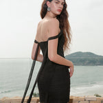 SHEER LUCK 2502 网纱飘带不规则一字领露肩性感包臀连衣裙 黑