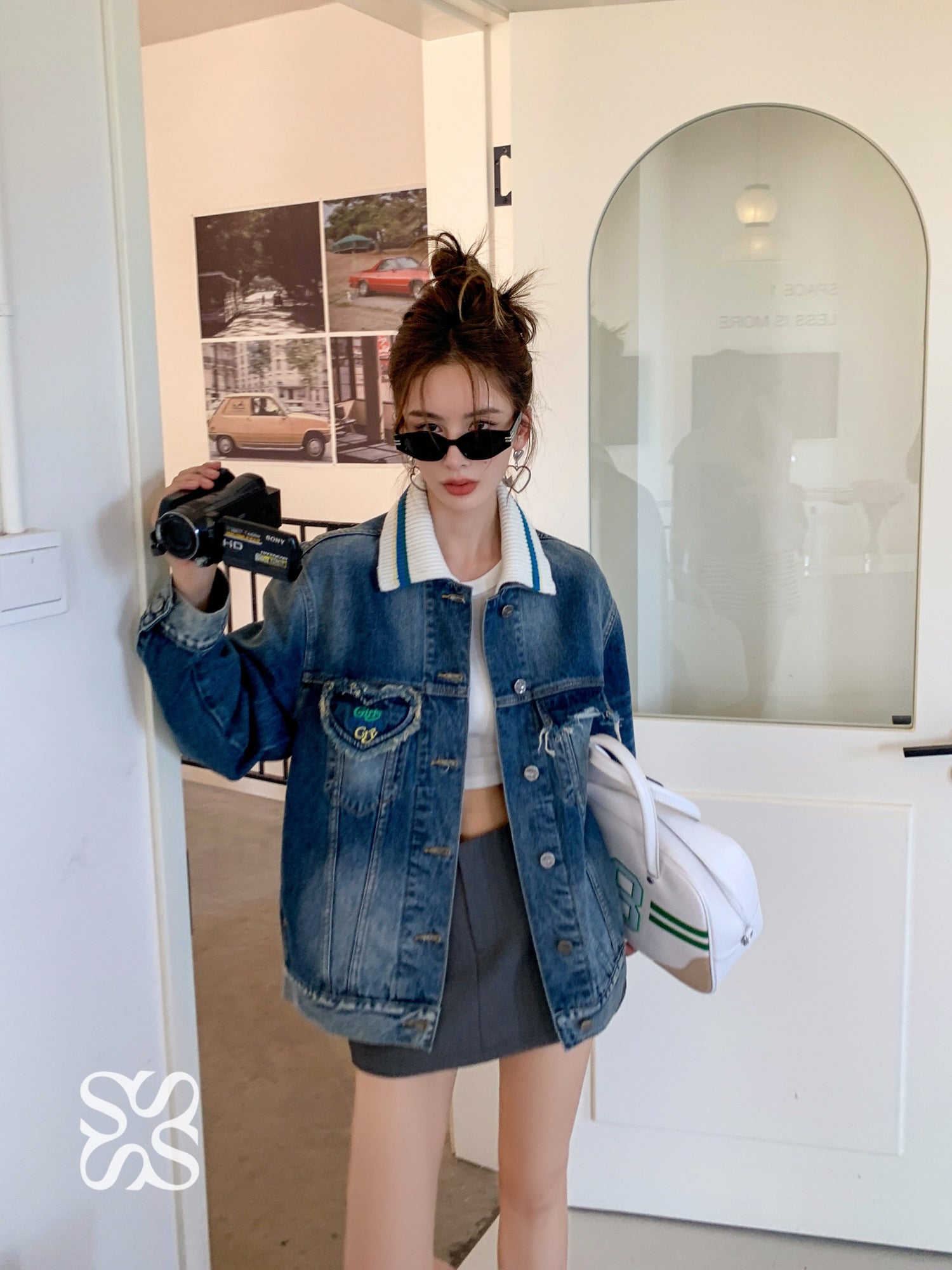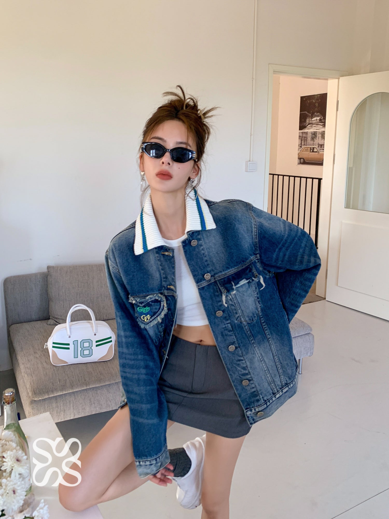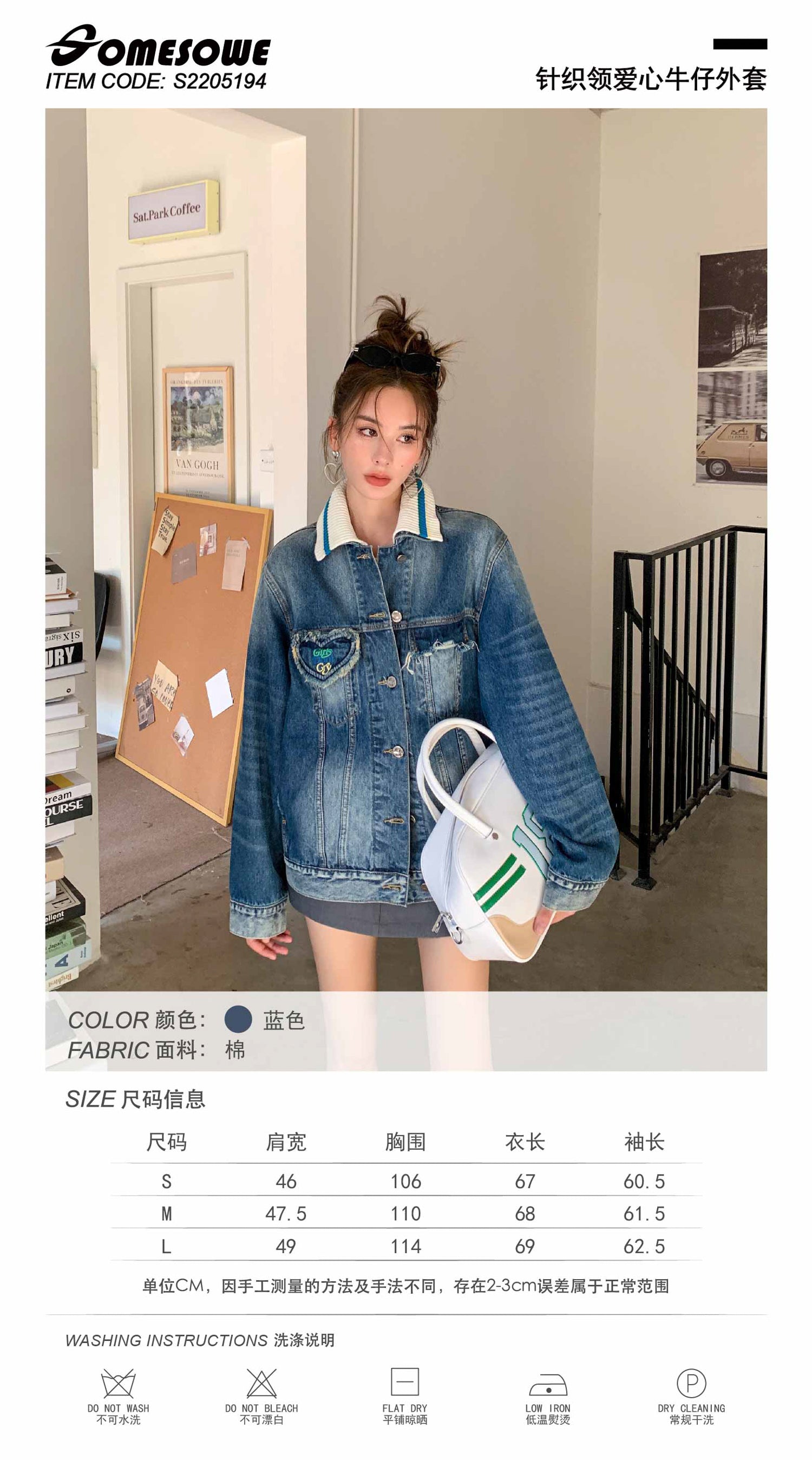 SOMESOWE 街头少女 针织领爱心牛仔外套