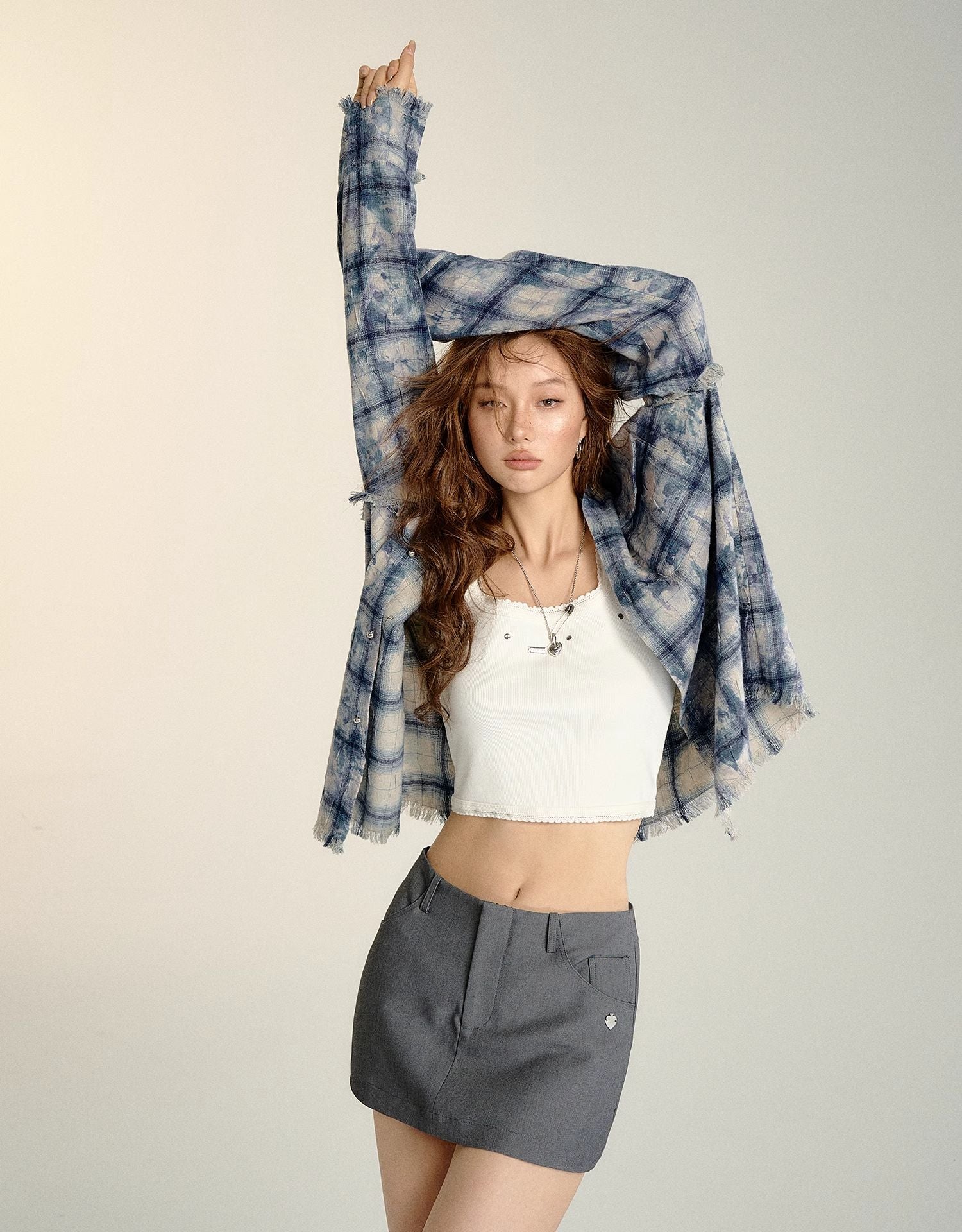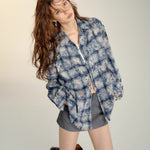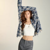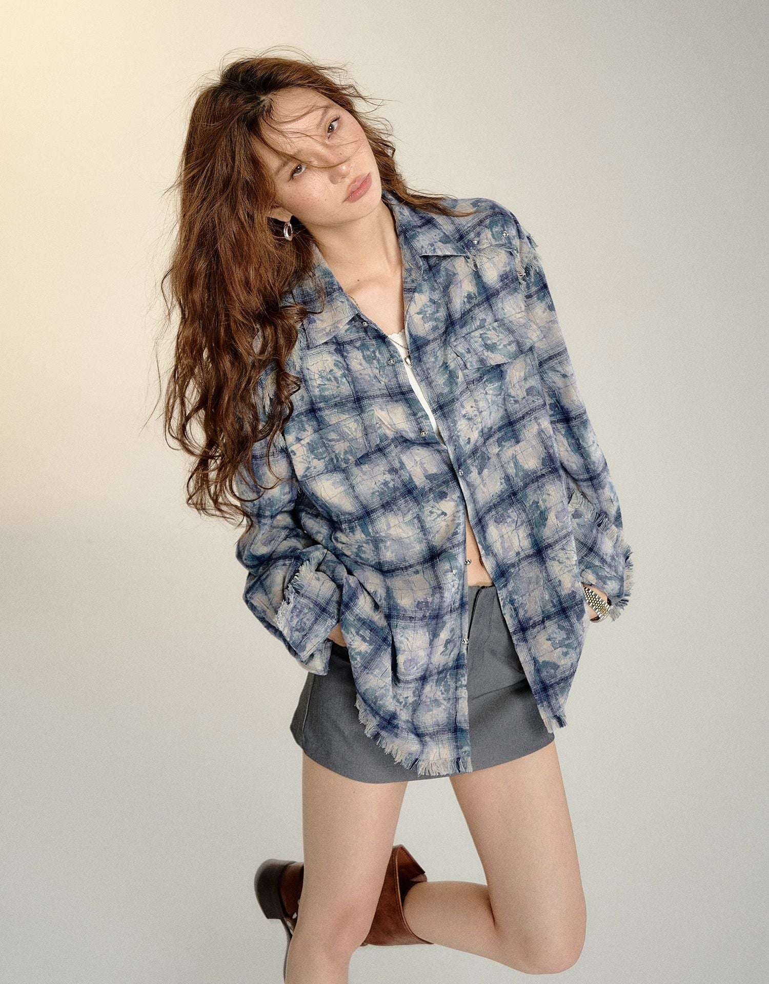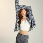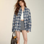 SOMESOWE 2408 扎染流苏格纹衬衫 蓝