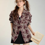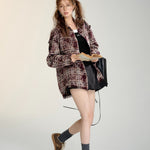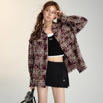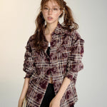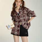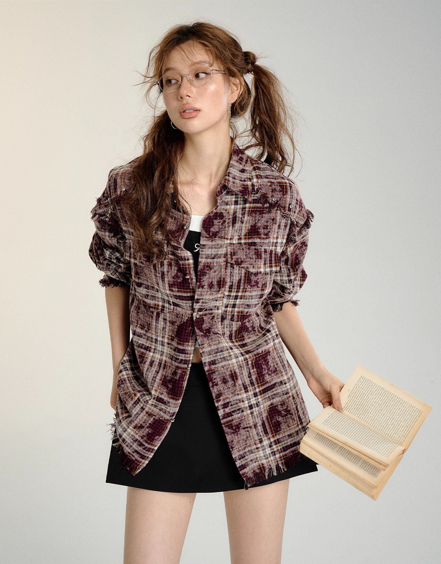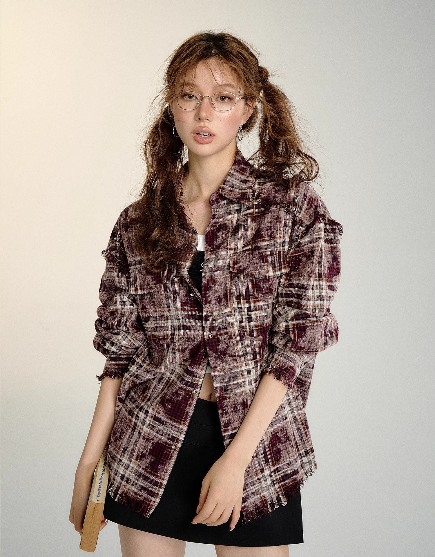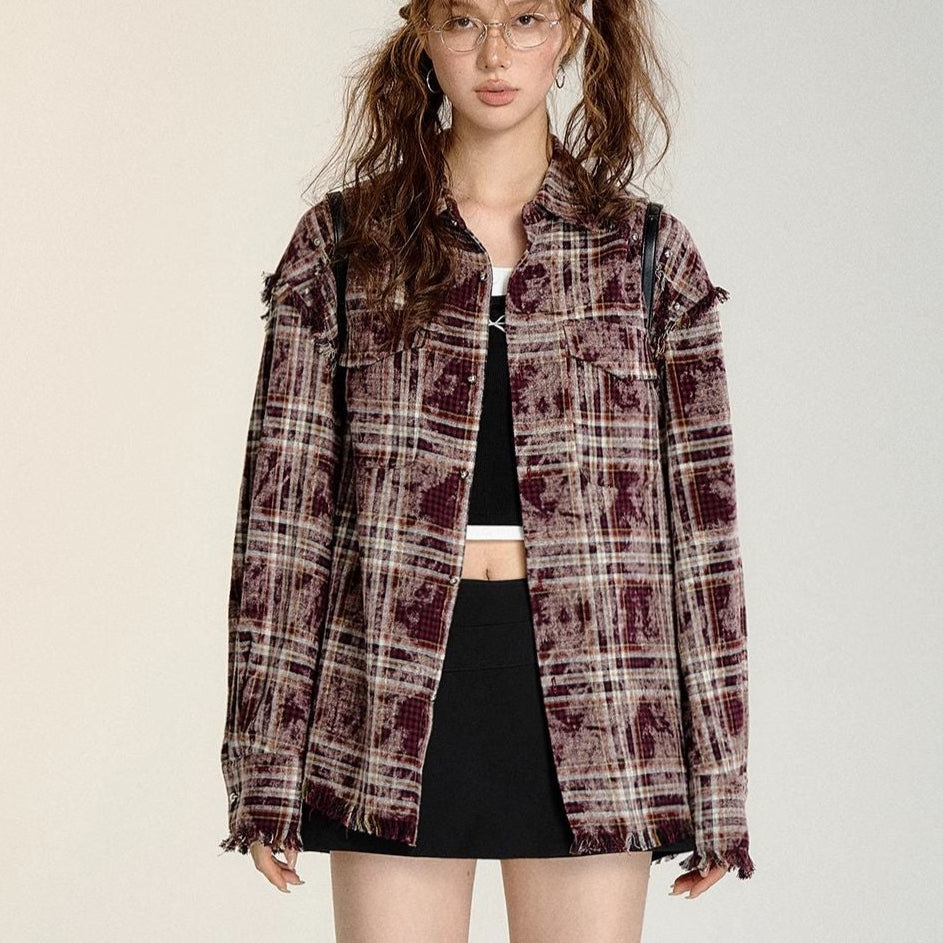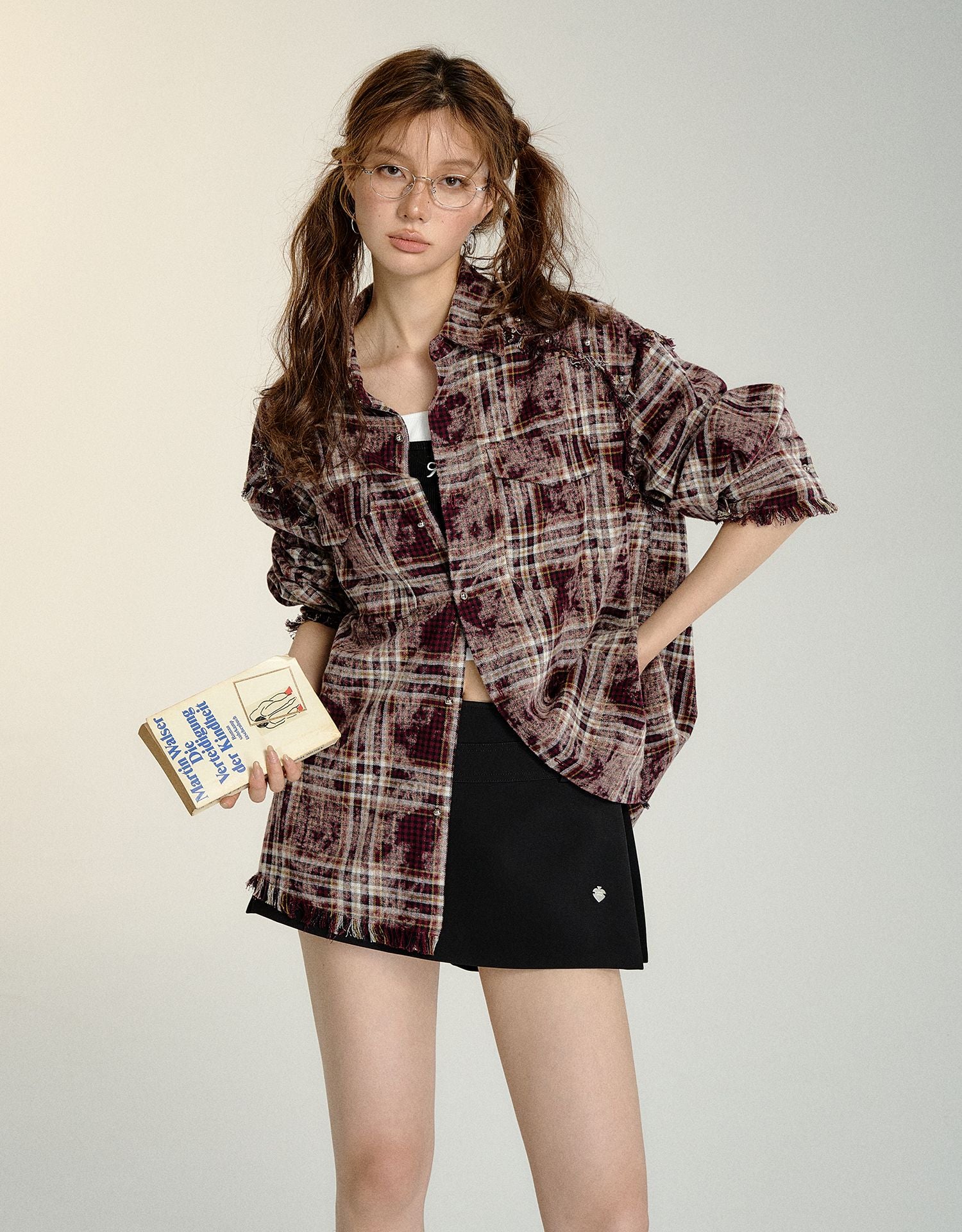 SOMESOWE 2408 扎染流苏格纹衬衫 酒红
