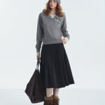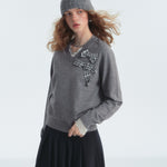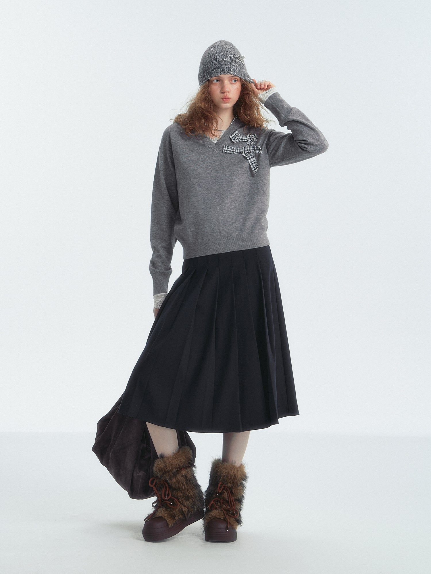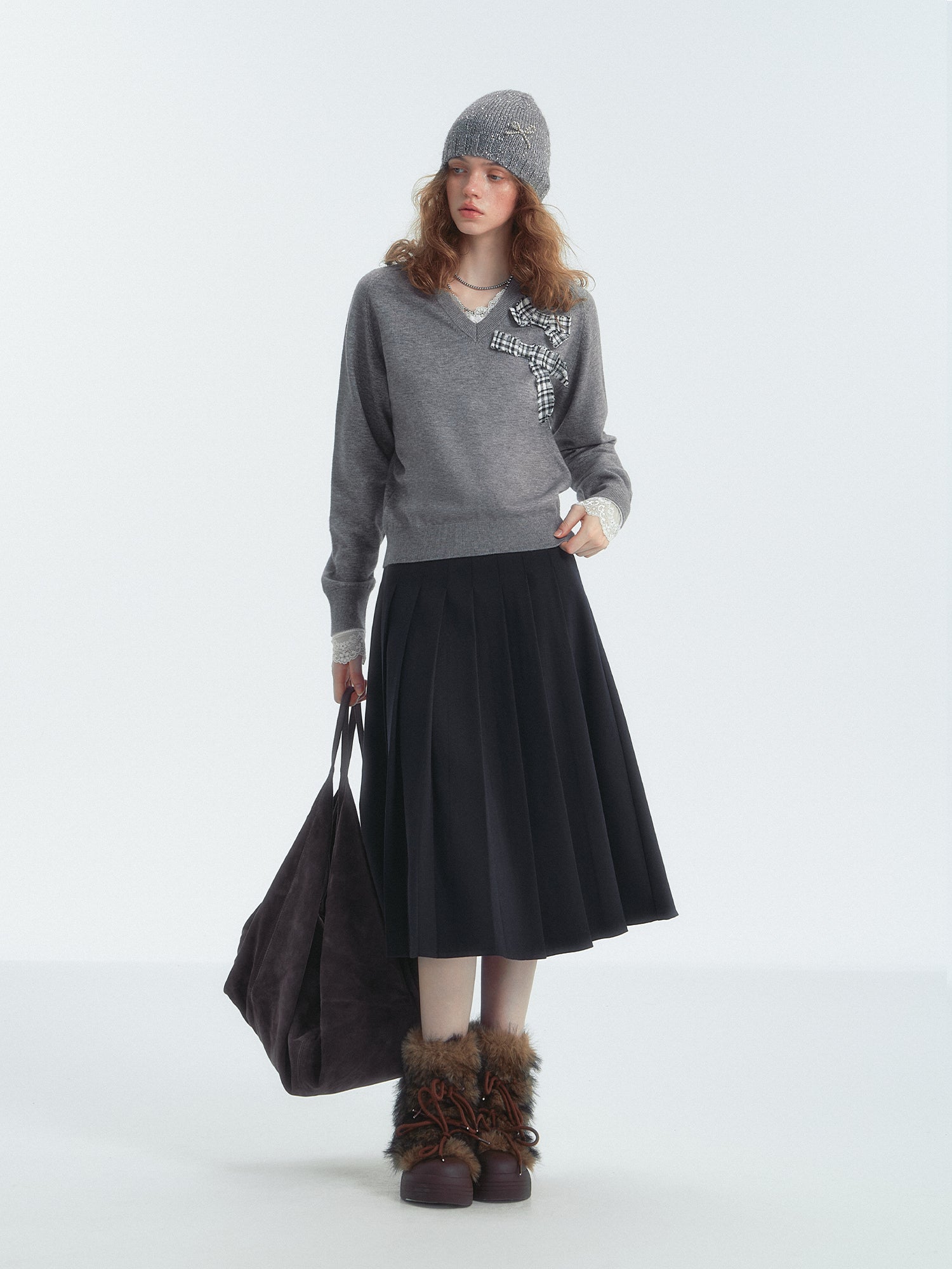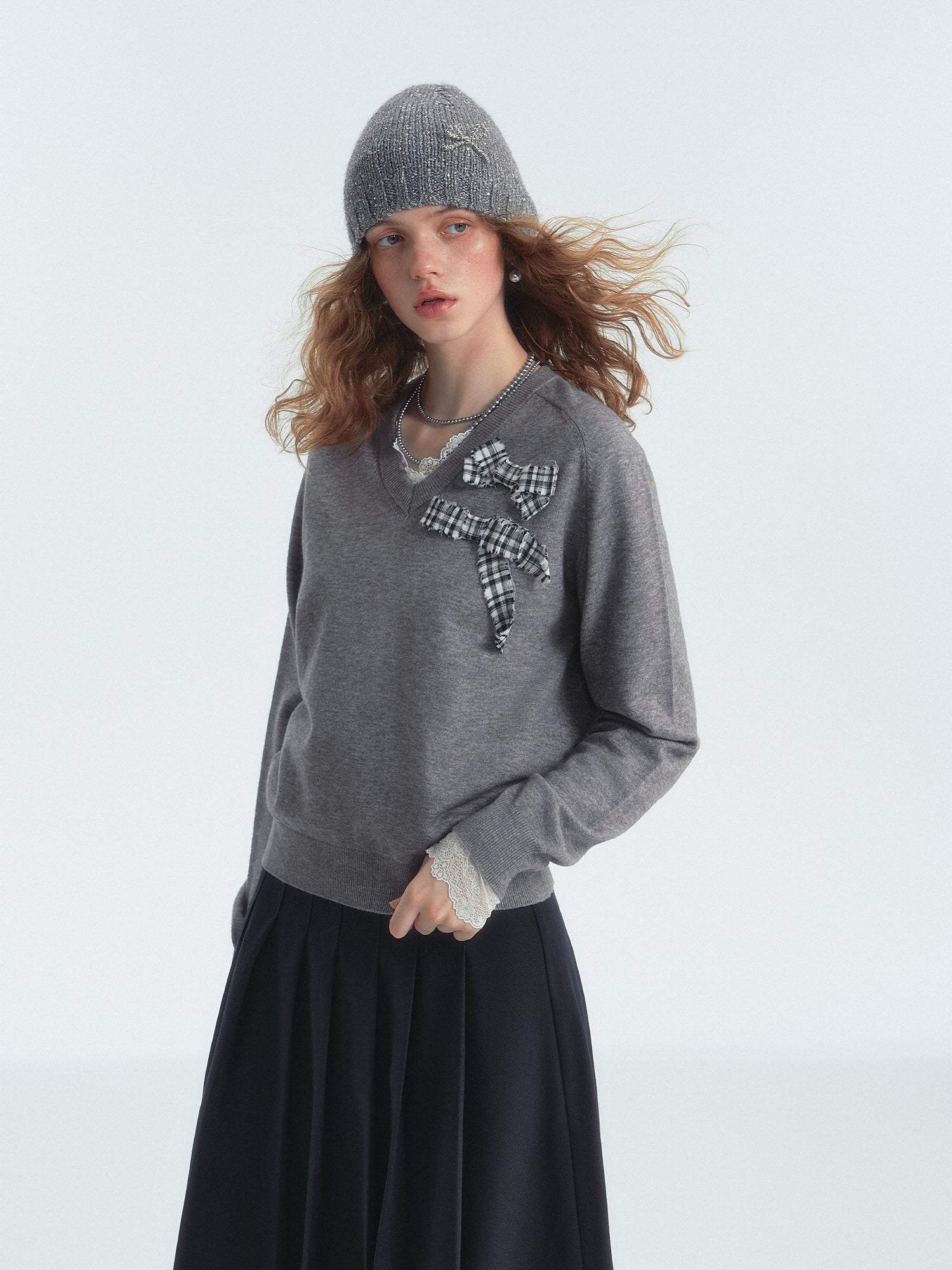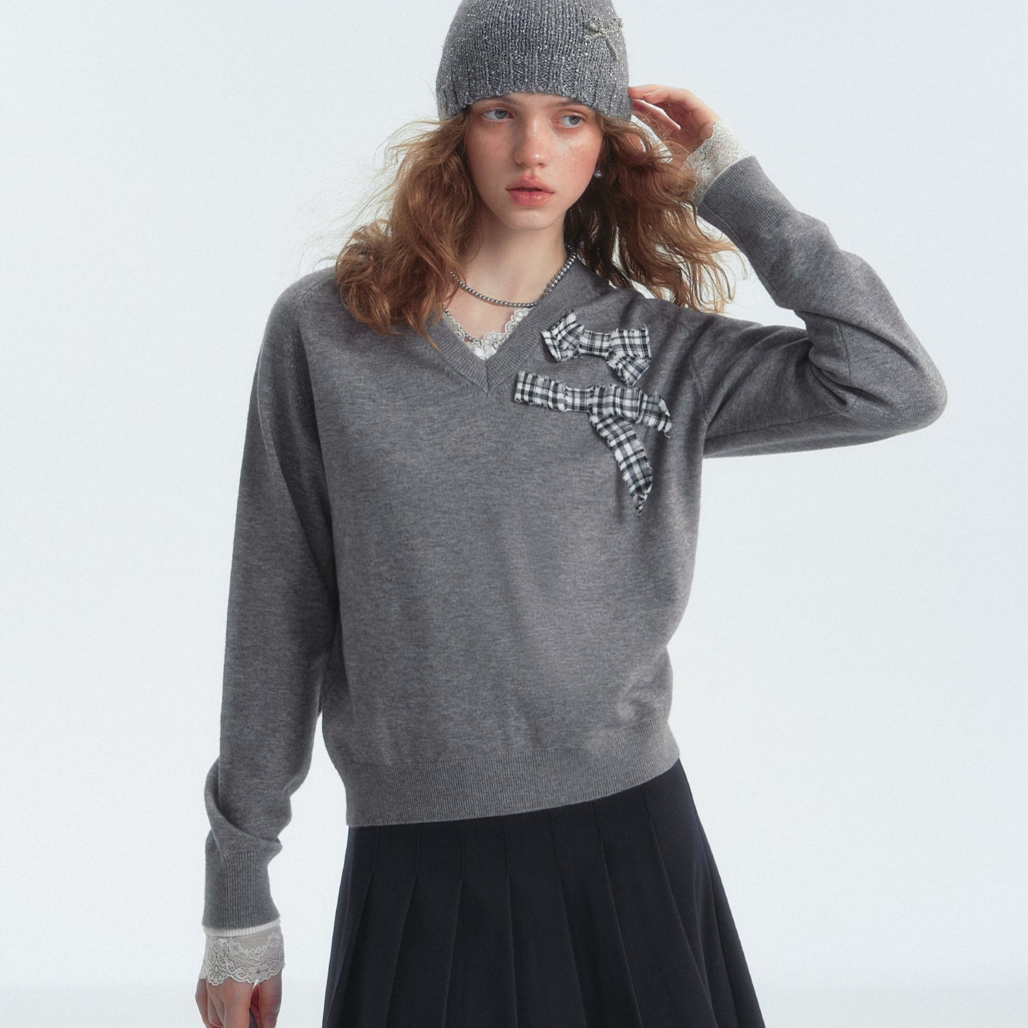SOMESOWE 2501 格纹蝴蝶结V领长袖毛衣 灰