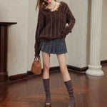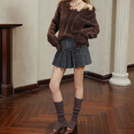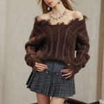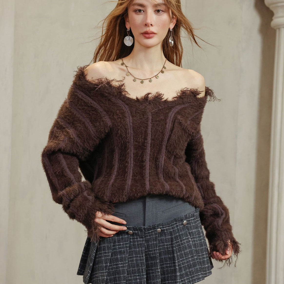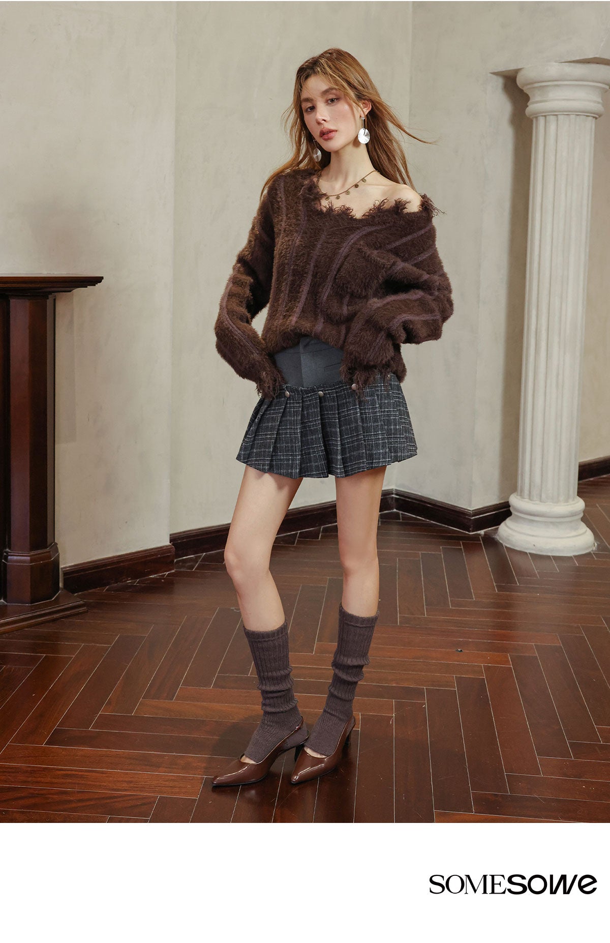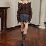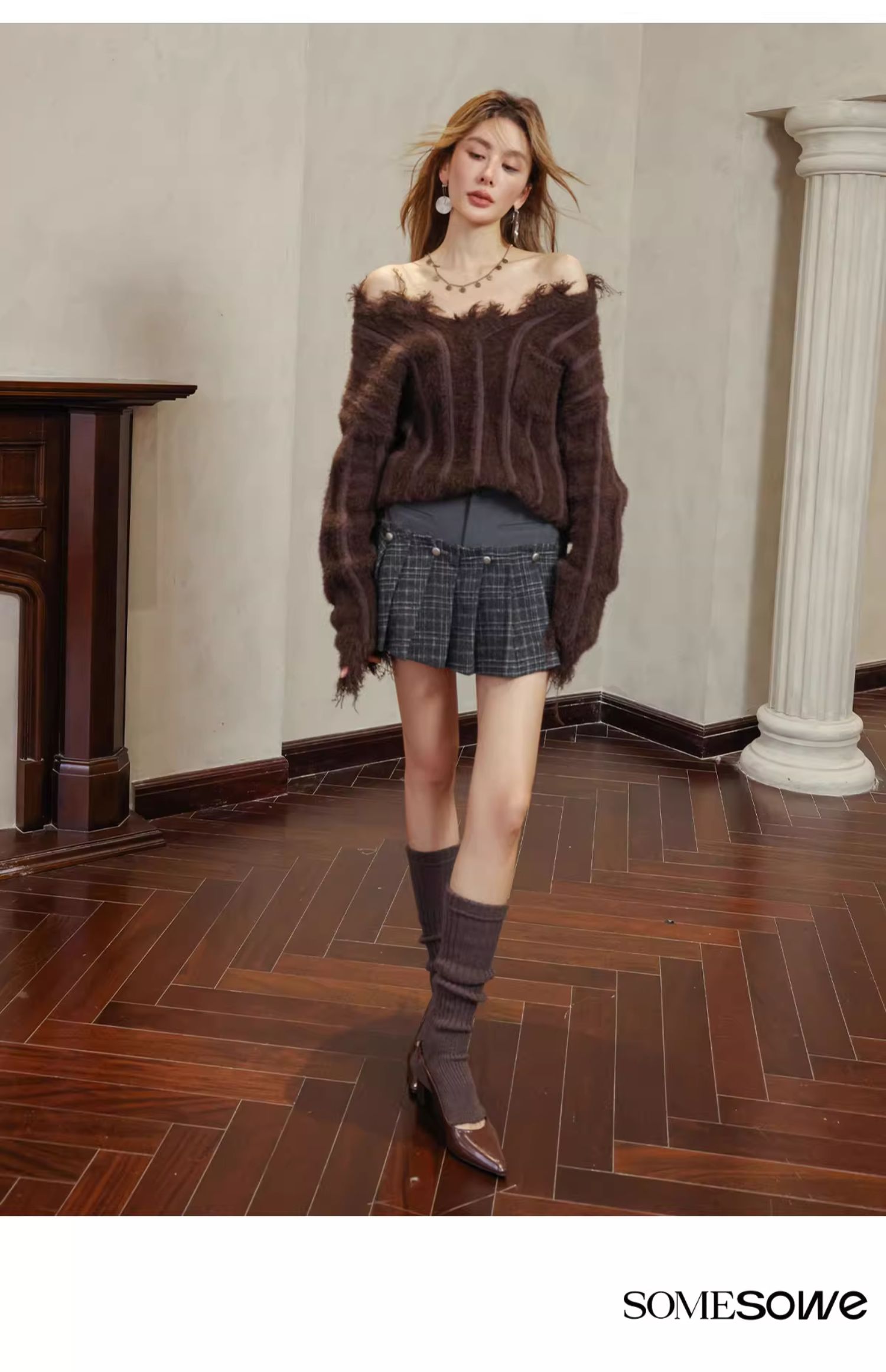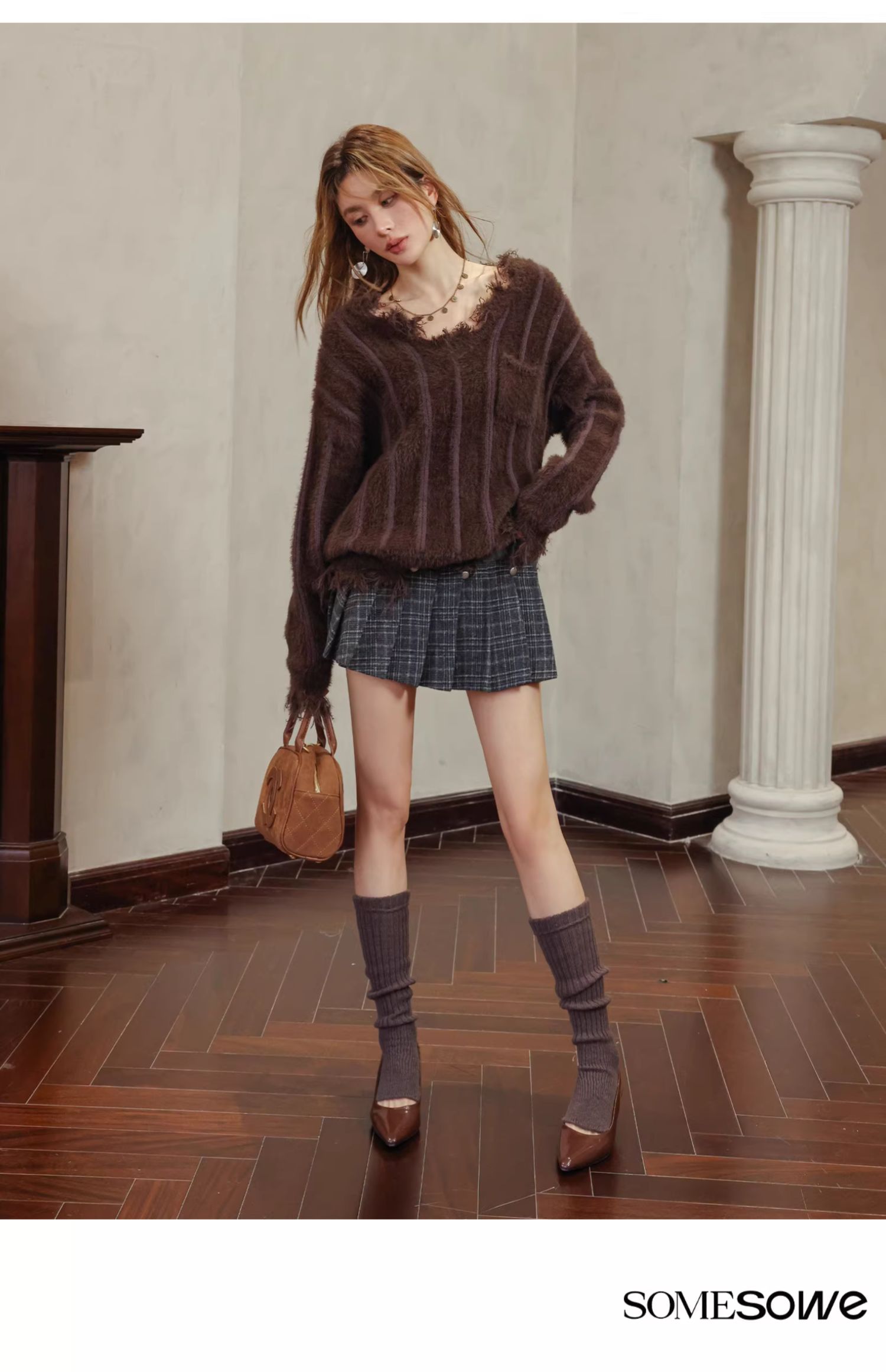SOMESOWE SS2401 V领破坏仿貂毛口袋毛衣 咖