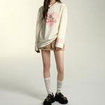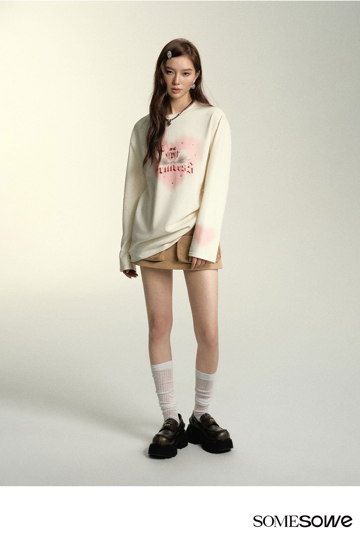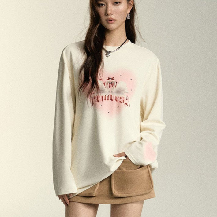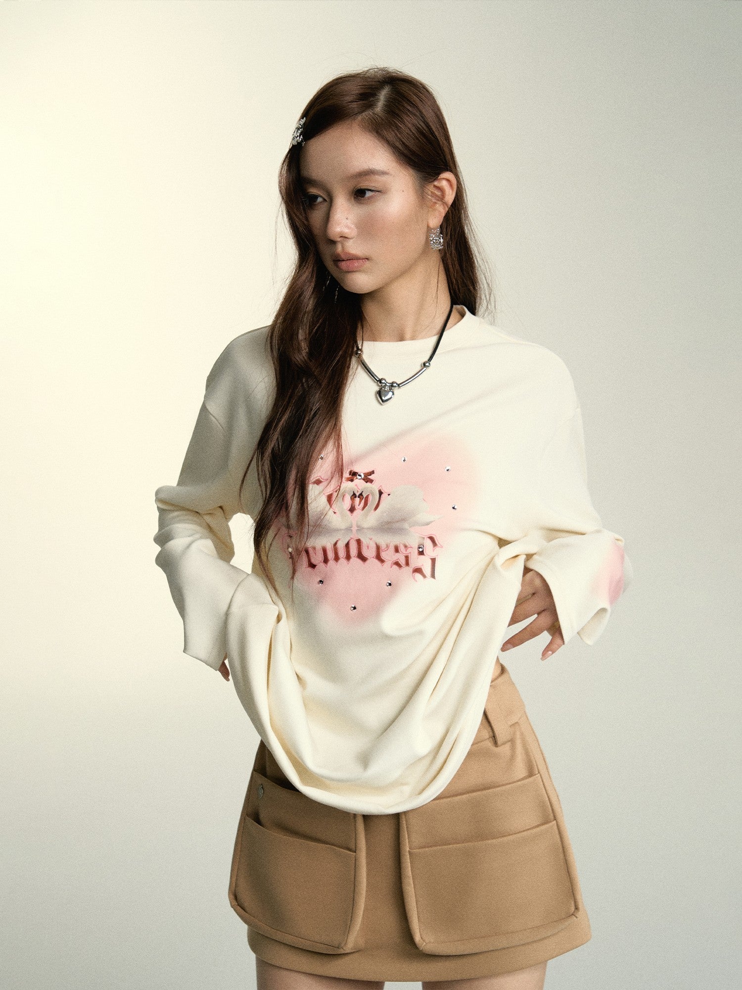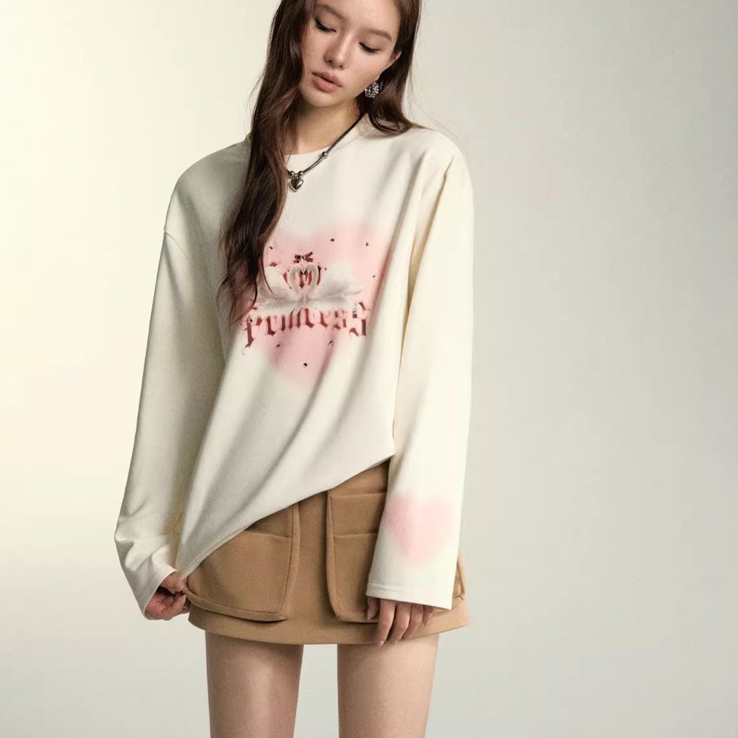 SOMESOWE SS2404 烫钻爱心天鹅印花长袖