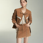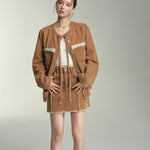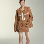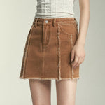 SOMESOWE SS2404 蕾丝拼接破缝须边牛仔半裙 咖