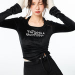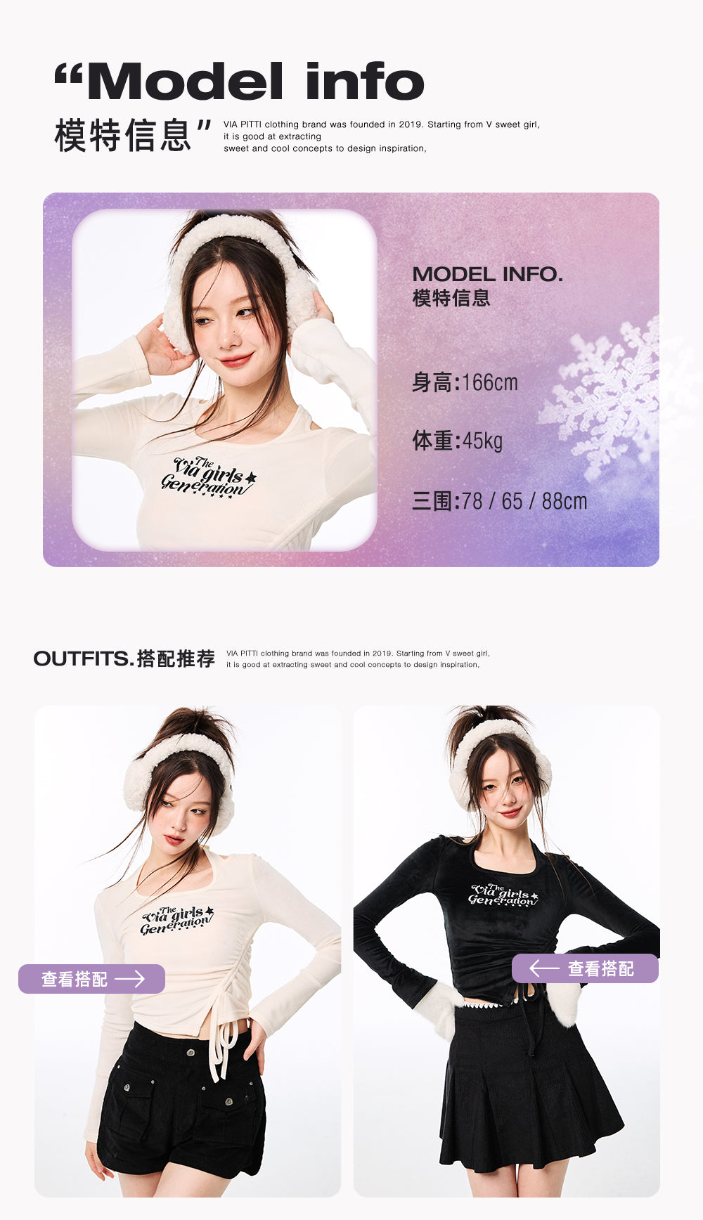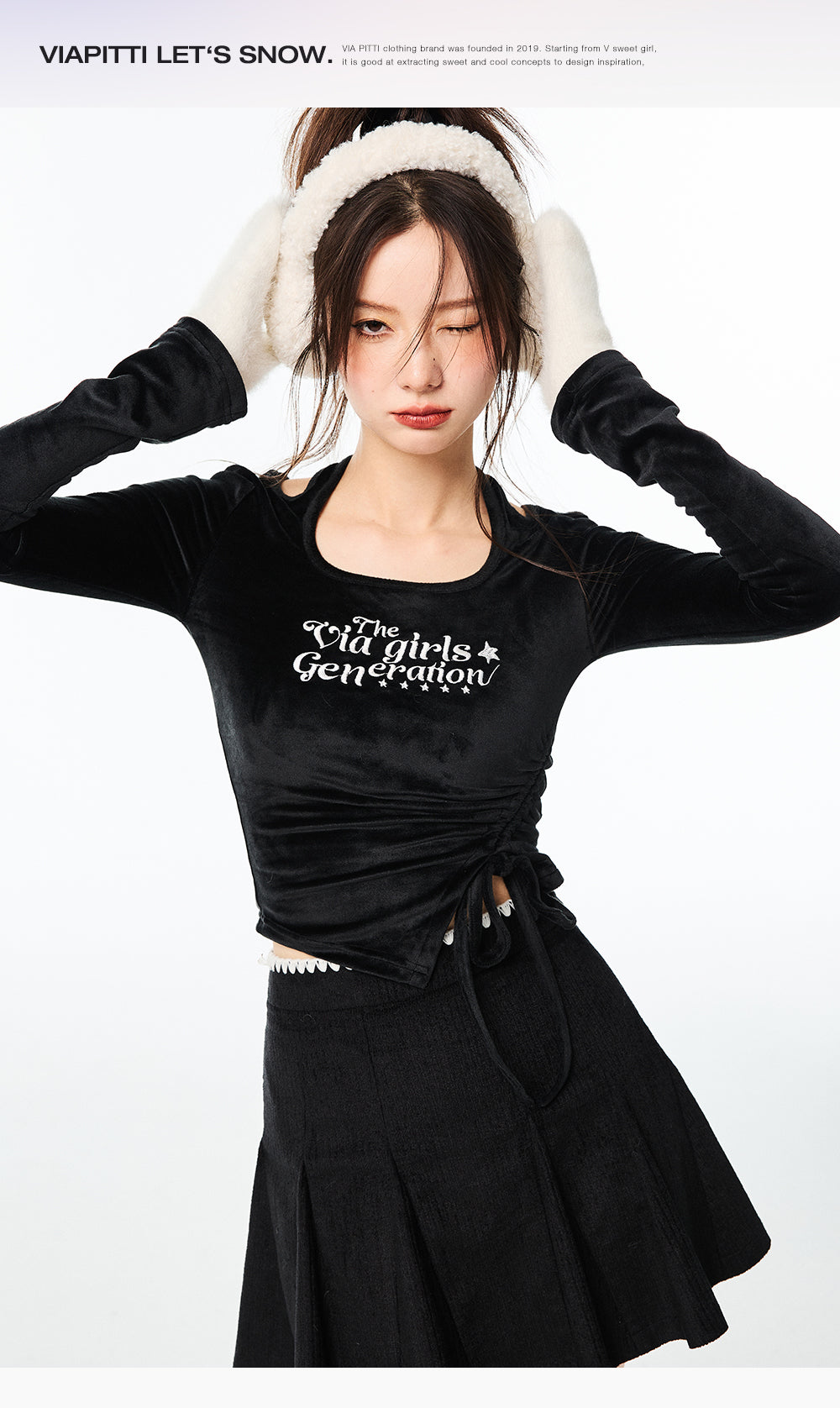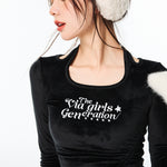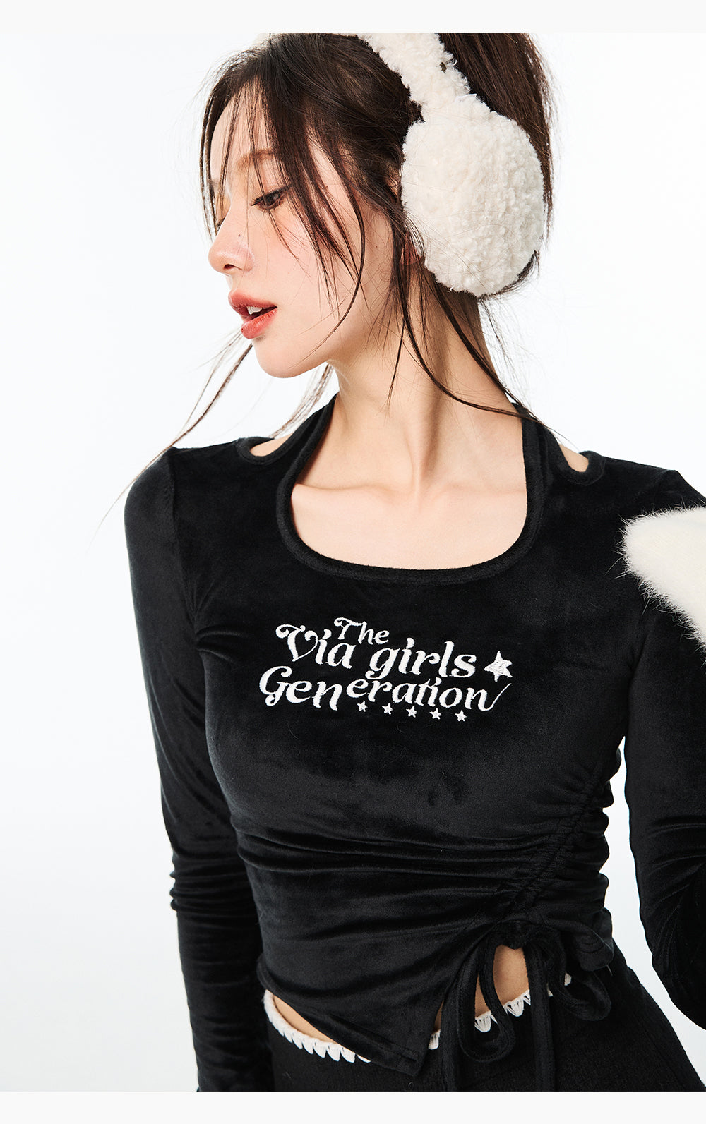 Via Pitti 毛茸茸刺绣挂脖长袖T打底衫 黑